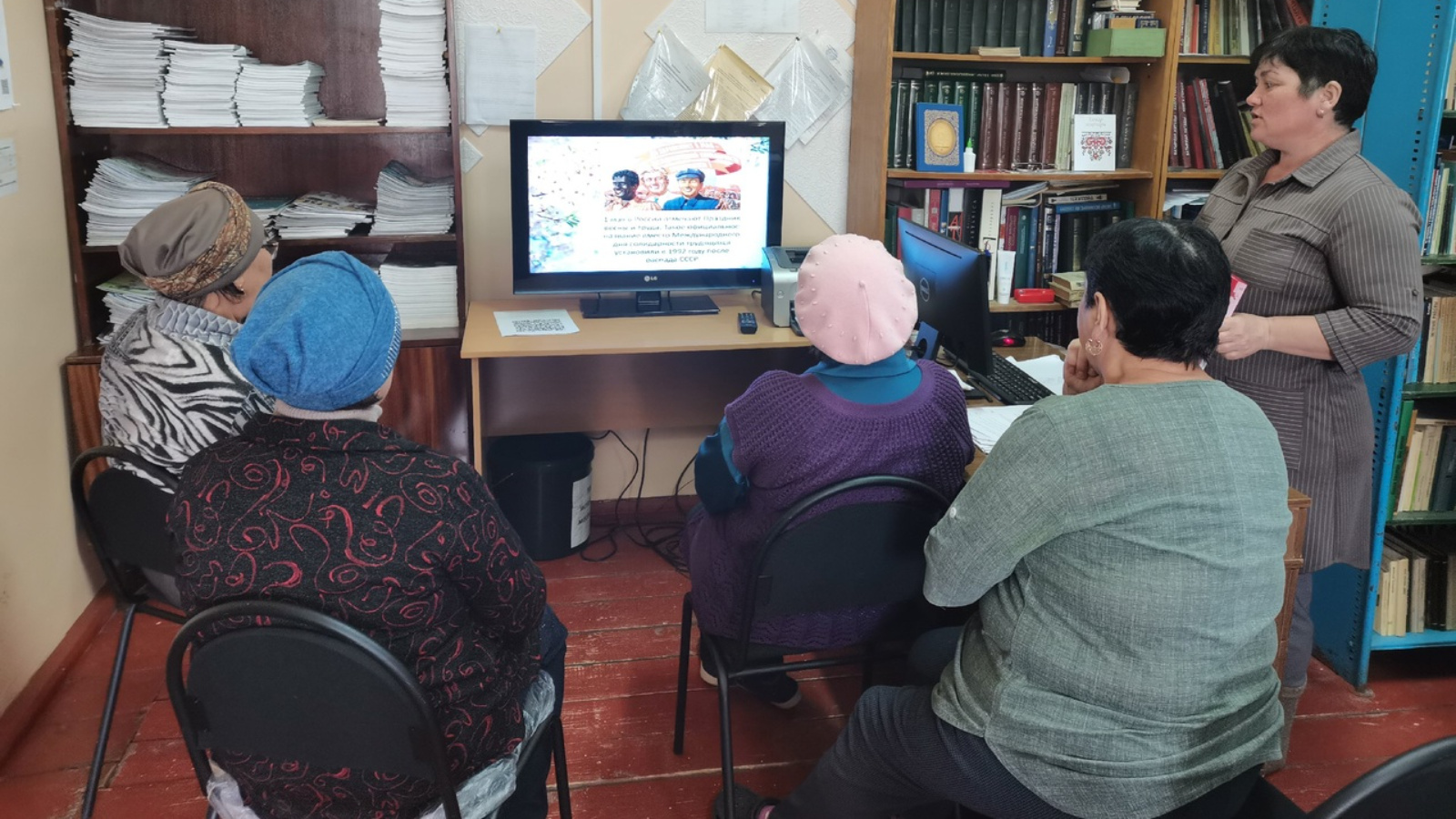 Библиотекарь подготовила презентацию о истории праздника. Вниманию был представлен видеоролик «1 мая, Первомайская демонстрация в СССР, вспомним как все это было...» Все желающие могли освежить свою память и поделится воспоминаниями о празднике своей молодости.